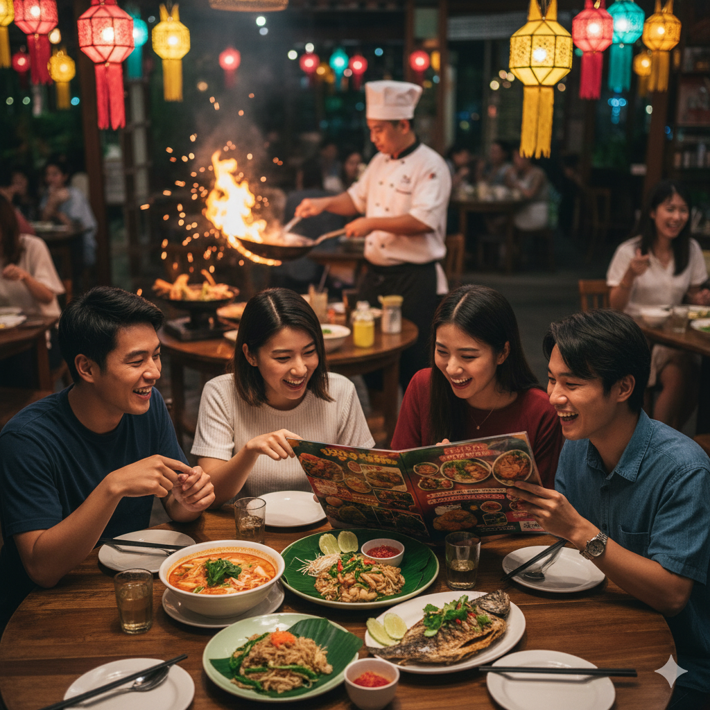 基本的な挨拶をマスターしたら、次は具体的なシーンで役立つ会話フレーズです。美味しいタイ料理を楽しむレストランや、お土産探しの買い物など、旅行中に必ず出くわす場面で使ってみましょう。