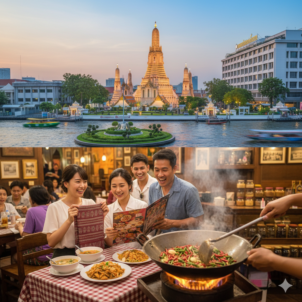 基本的な挨拶をマスターしたら、次は具体的なシーンで役立つ会話フレーズです。美味しいタイ料理を楽しむレストランや、お土産探しの買い物など、旅行中に必ず出くわす場面で使ってみましょう。