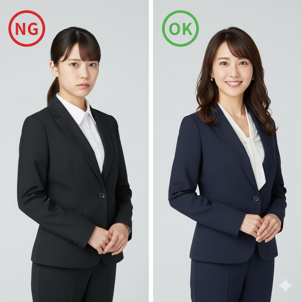 原色(赤、黄色など)や、黒・紺などの暗い色は避けましょう。原色は派手で自己主張が強すぎると見なされますし、暗い色は顔色をくすませ、表情を硬く見せてしまう可能性があります。あくまで主役は「あなた自身」なので、服装が目立ちすぎるのはNGですね。