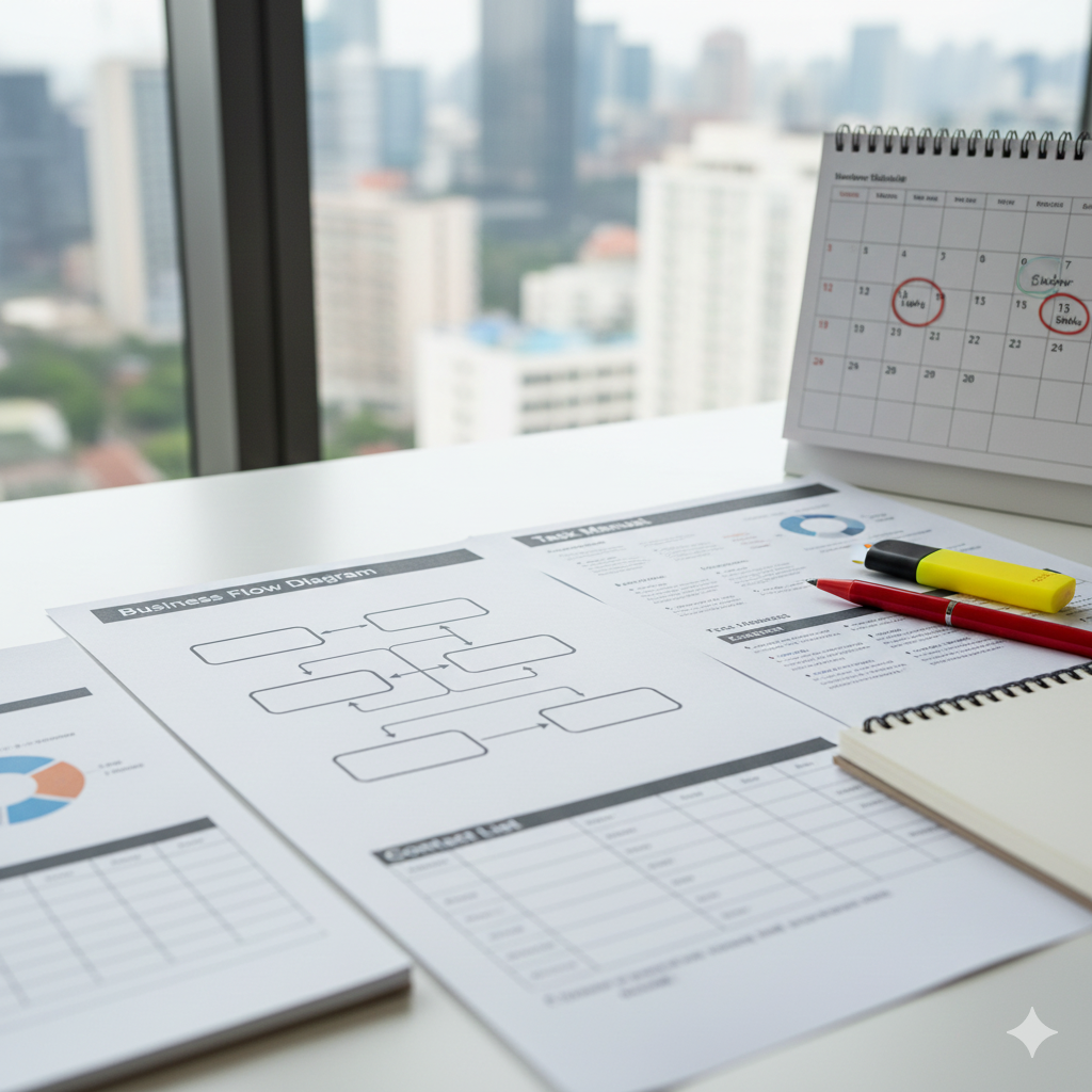 手順書(マニュアル)複雑な作業や独自のノウハウが必要な業務について、スクリーンショットなどを用いて誰でもわかるようにまとめる。
