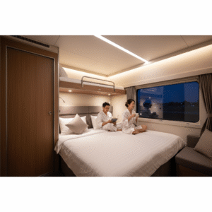 夜になると、このソファが二段ベッドへと変わります。個室の扉を閉めれば、完全に2人だけの空間となり、周囲の目を気にすることなく過ごせるのが最大の魅力です。通路を人が行き来する音もほとんど気にならず、静かな環境で休むことができます。新婚旅行や特別な記念日の旅行などで、少し贅沢な列車旅を楽しみたい場合にぴったりの選択肢と言えるでしょう。