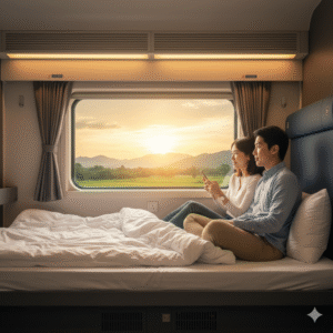 前述の通り、プライベートな空間を確保したい2人旅には、1等寝台の個室が最適です。日中は快適なソファ席として利用でき、窓の外の景色を楽しみながらリラックスした時間を過ごせます。