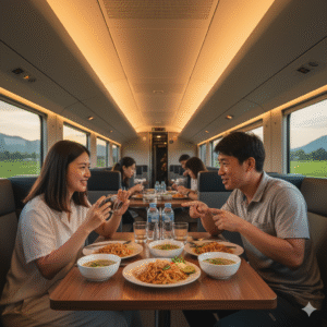 食堂車へ行かなくても、スタッフが座席まで注文を取りに来てくれ、出来上がると届けてくれるサービスもあります。ただし、味や価格を考慮すると、乗車前に駅のフードコートで食事を済ませたり、好きな食べ物や飲み物を持ち込んだりする乗客も多いです。朝方にはコーヒーや軽食の車内販売もあります。