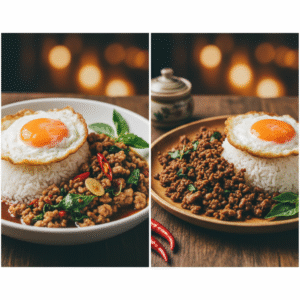 ガパオライスには、大きく分けて2つのスタイルがあります。一つは、しっかりと炒めて水分を飛ばした「ガパオヘーン(汁なし)」。そぼろご飯のようなドライな食感が特徴です。もう一つは、炒め汁が多めの「ガパオナーム(汁あり)」で、ご飯と絡めて食べるとジューシーな味わいが楽しめます。どちらのスタイルが好きか、自分の好みを見つけてみるのも面白いです。