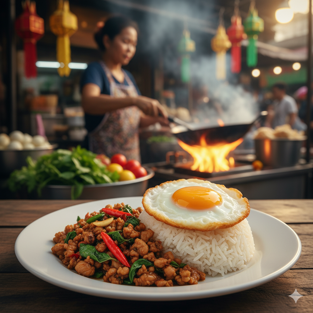 ガパオライスは、今や日本でも人気のタイ料理ですが、その基本を知るとバンコクでの店選びがさらに楽しくなります。まず、「ガパオ」とはタイのホーリーバジルのことで、このハーブを使った炒め物を「パッガパオ」と呼びます。これをご飯にのせたものが、私たちがよく知るガパオライスです。
