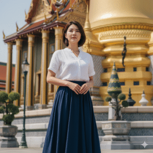 推奨される服装の具体例としては、「半袖Tシャツやブラウス」に「ロングスカートや長ズボン」を合わせるのが最も簡単で間違いのないスタイルです。風通しの良いリネン素材のシャツや、ゆったりとしたシルエットのワイドパンツなども、タイの気候に適しておりおすすめです。