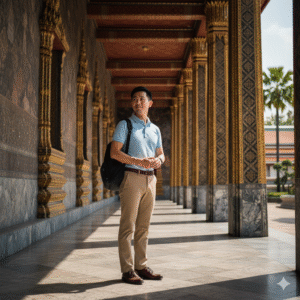 最も無難で推奨される服装は、「Tシャツやポロシャツ」に「長ズボン」の組み合わせです。ジーンズでも問題ありませんが、前述の通り、ダメージ加工のあるものは避けましょう。チノパンやカーゴパンツなども動きやすく、寺院巡りに適しています。