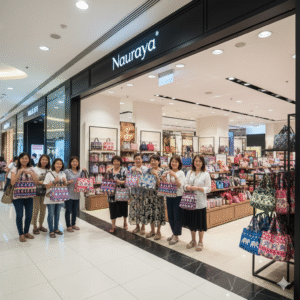 ナラヤの大きな特徴は、ハンドメイドへのこだわりです。商品は自社工場で製造され、タイの地元コミュニティが生産に参加。職人さんが一針一針丁寧に縫い上げることで、高品質ながらも温かみのある製品を生み出しています。これにより、地域社会への経済的還元や生活改善にも貢献しているのです。