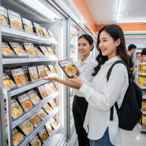 タイのセブンイレブンの冷蔵コーナーは、まるでタイ料理のレストランのようです。驚くほど充実したお弁当類が揃っており、その多くが電子レンジで温めるだけで本格的な味を楽しめます。