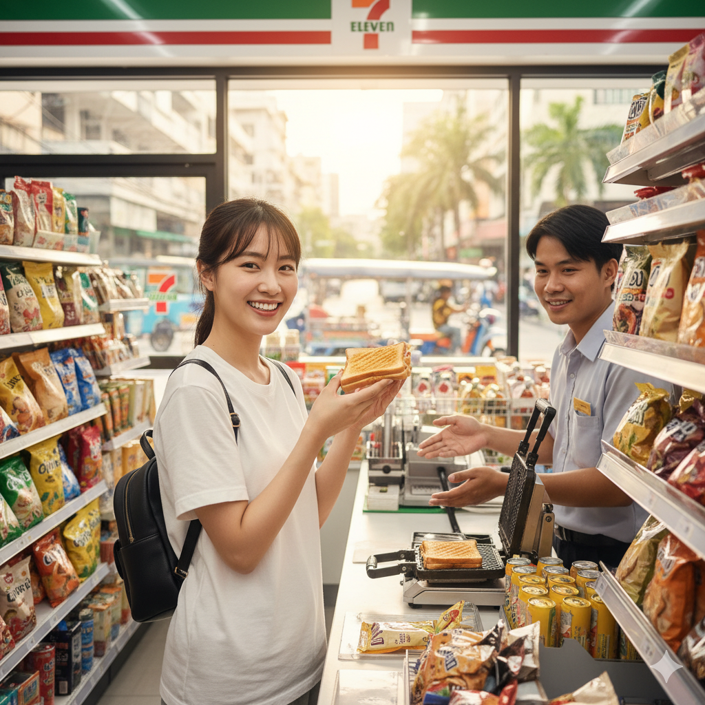 タイのセブンイレブンを訪れたら、まず試していただきたいのがレジで焼いてもらうホットサンドです。これは単なるサンドイッチではなく、購入後に店員さんが専用のホットサンドメーカーでプレスして焼き上げてくれるサービスが特徴です。