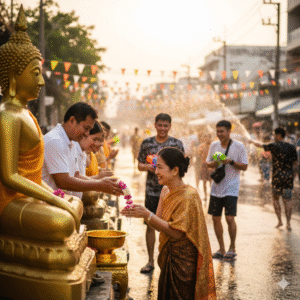 - 年長者への敬意(ロット・ナム・ダムフア):両親や祖父母、尊敬する年長者の手に水をかけ、新年の祝福を願います。年長者はそのお返しに、若い世代へ祝福の言葉を与えます。