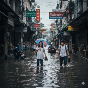 「雨季はやばい」というイメージは、主に洪水や冠水のリスクから来ています。特に雨季の終盤である9月や10月は、連日の雨でチャオプラヤー川の水位が上昇し、川沿いの地域で洪水が発生することがあります。